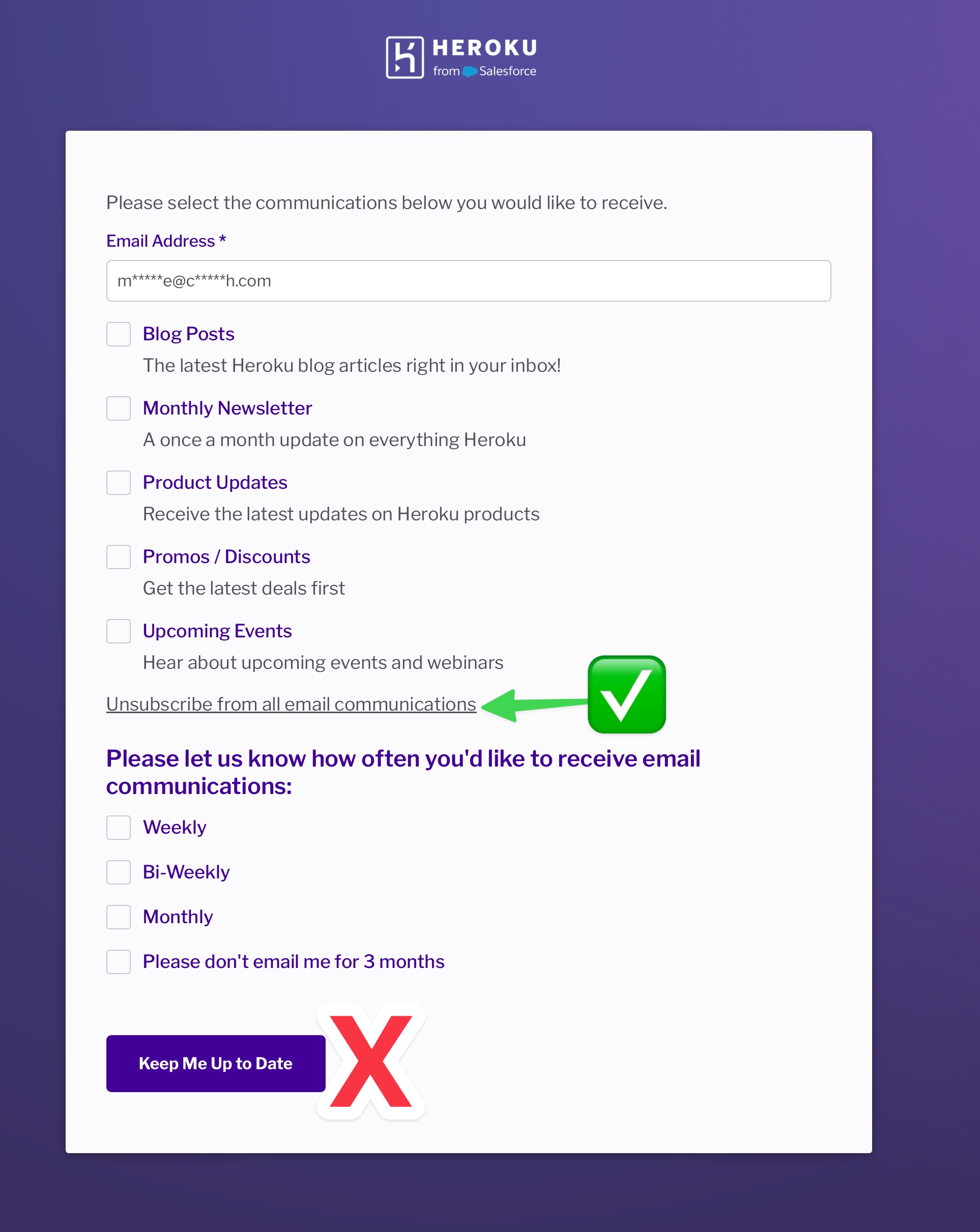DesignHeroku, the cloud hosting platform that used to be kind of nice but after being purchased by Salesforce is a shadow of itself, sends me emails. I had an account for a previous consulting client, and even though they are moved off of Heroku my email is still on some mailing list. I try to be good about unsubscribing to things I don’t want to keep my inbox focused so I decided to finally kill this Heroku newsletter.