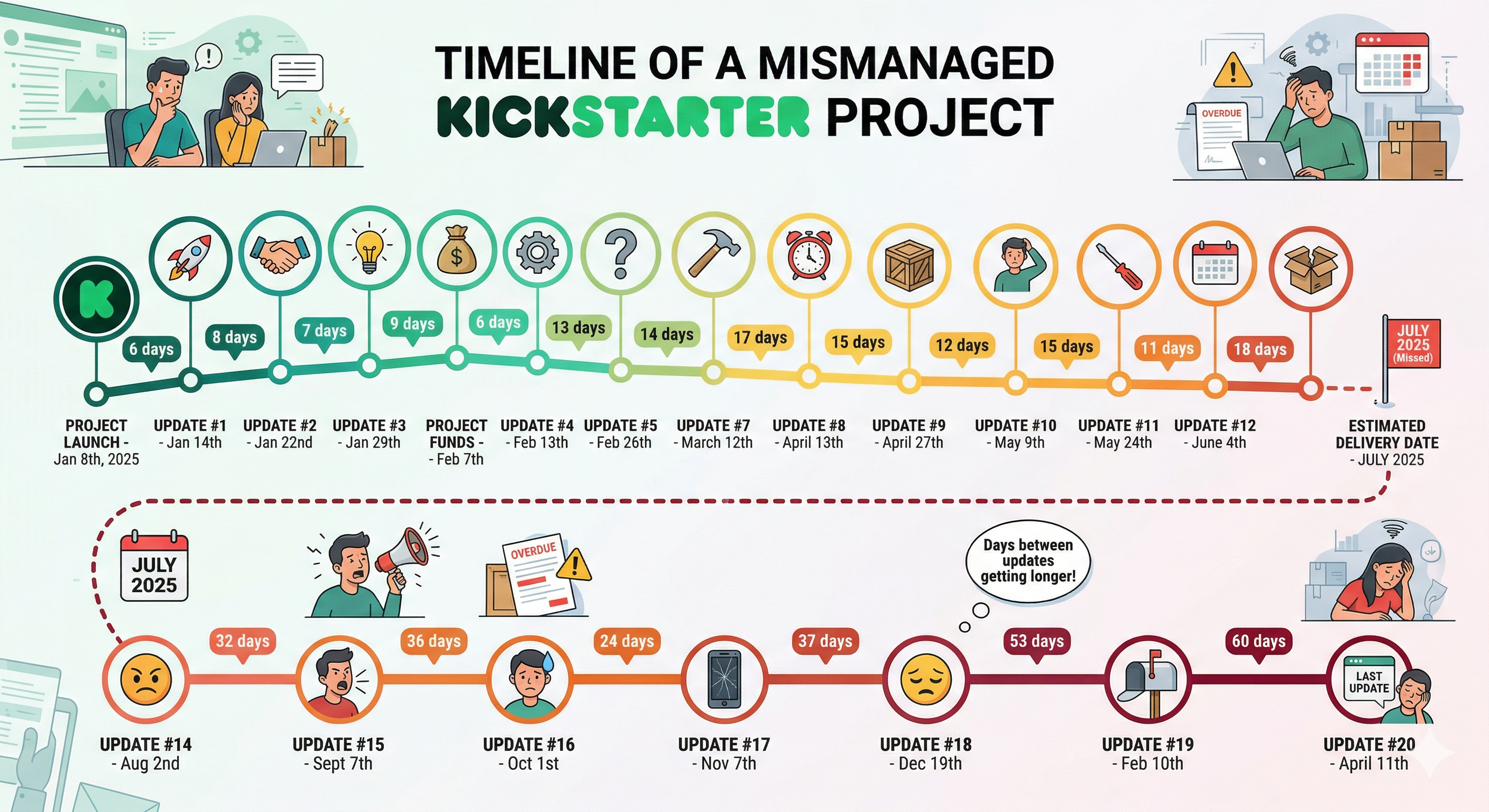 Kickstarter is a gamble, but there has to be some trust there, and it can’t be that much of a gamble, or the customers will never return. Things can happen. The Tump admin’s tariffs no doubt made hardware manufacturing harder and more expensive. It seems likely that they at best fibbed when it comes to their marketing materials, as the device in those photos and videos has never been seen again. Despite all that, though, they could still have the crowd on their side. There was a path. They had to communicate.