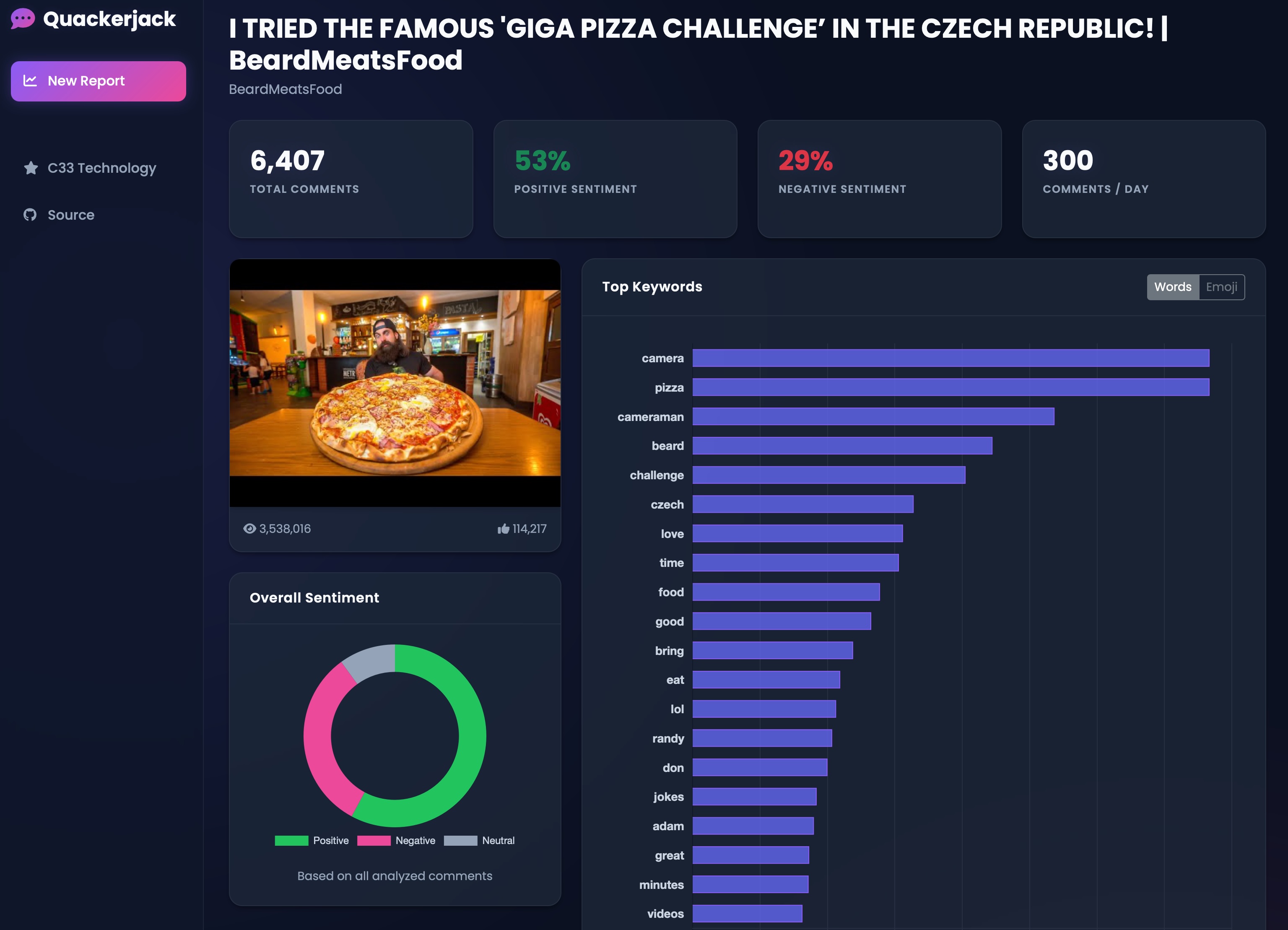Quackerjack is a social media comment sentiment analysis application and API that is used by many companies around the globe for a quick and easy way to analyze the comment threads on YouTube videos.